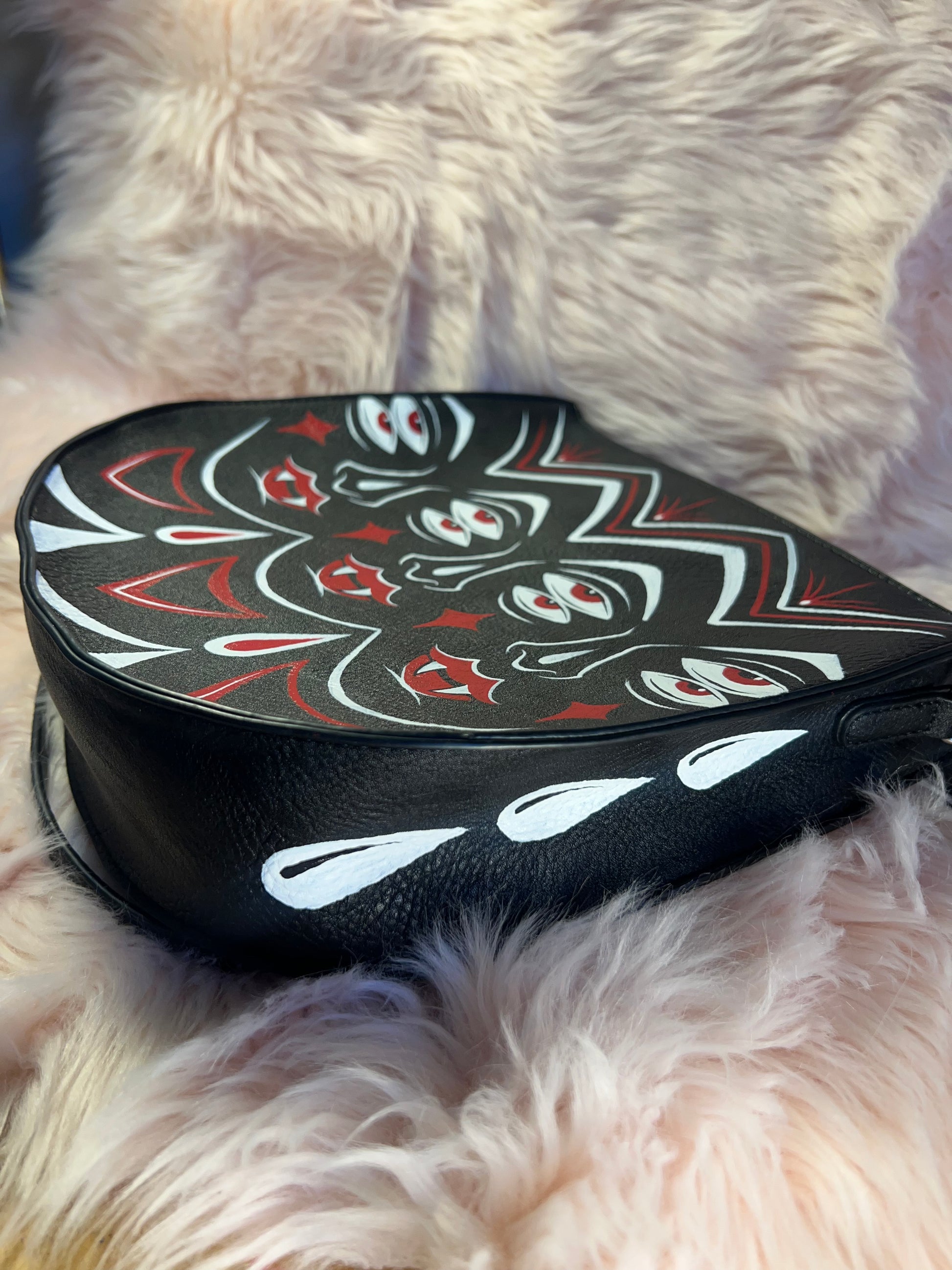 Vegan leather, saddle shaped bag with shoulder strap and zip closure.